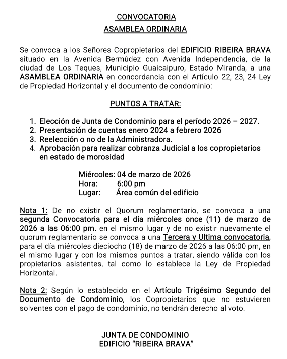 La Junta de Condominio del Edificio Ribeira Brava, ubicado en la intersección de la avenida Bermúdez con avenida Independencia de Los Teques, Municipio Guaicaipuro, Estado Miranda, convocó a los copropietarios a una Asamblea Ordinaria el próximo miércoles 4 de marzo de 2026, a las seis de la tarde, en el área común del edificio.