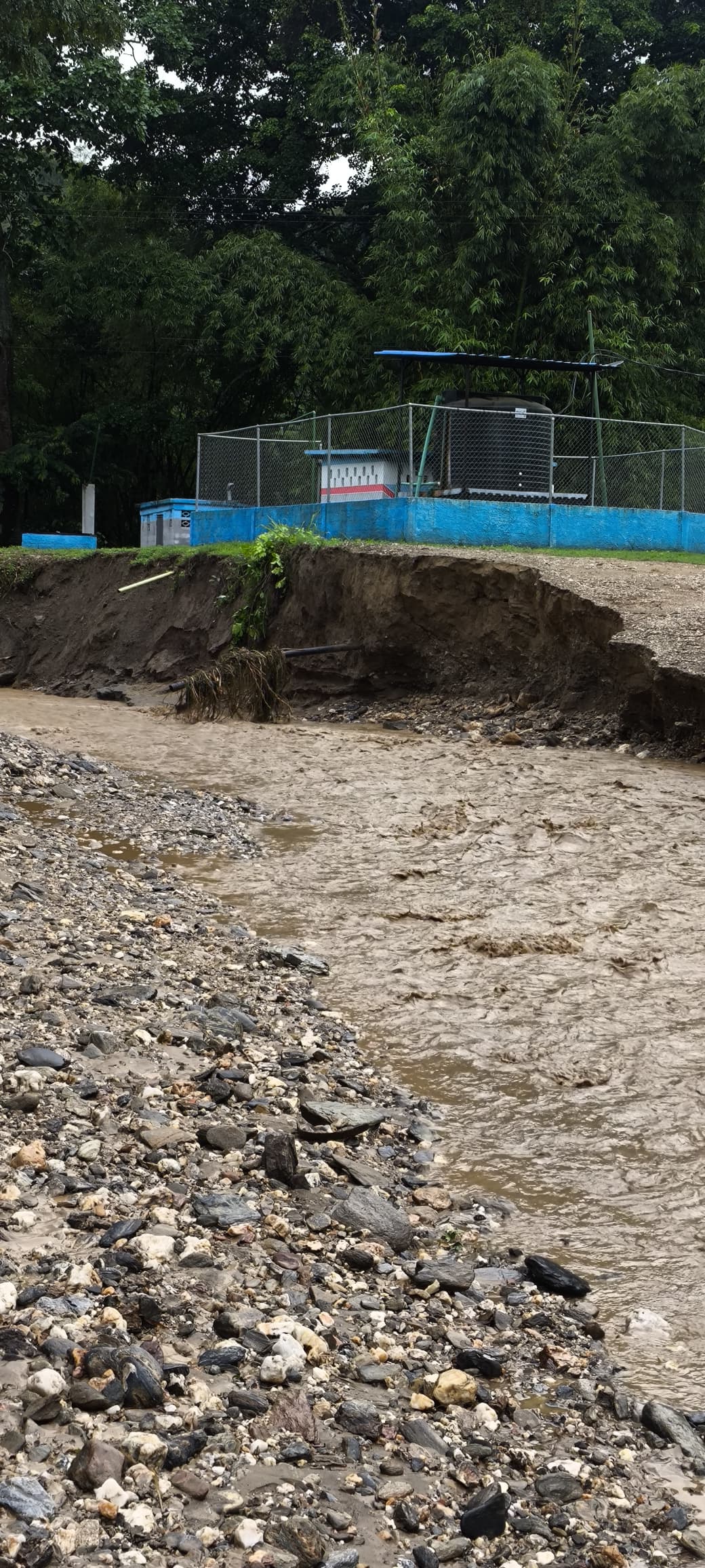 La crecida del río local puso en riesgo la estructura que alberga la bomba de agua principal de la zona, utilizada para el abastecimiento comunitario.