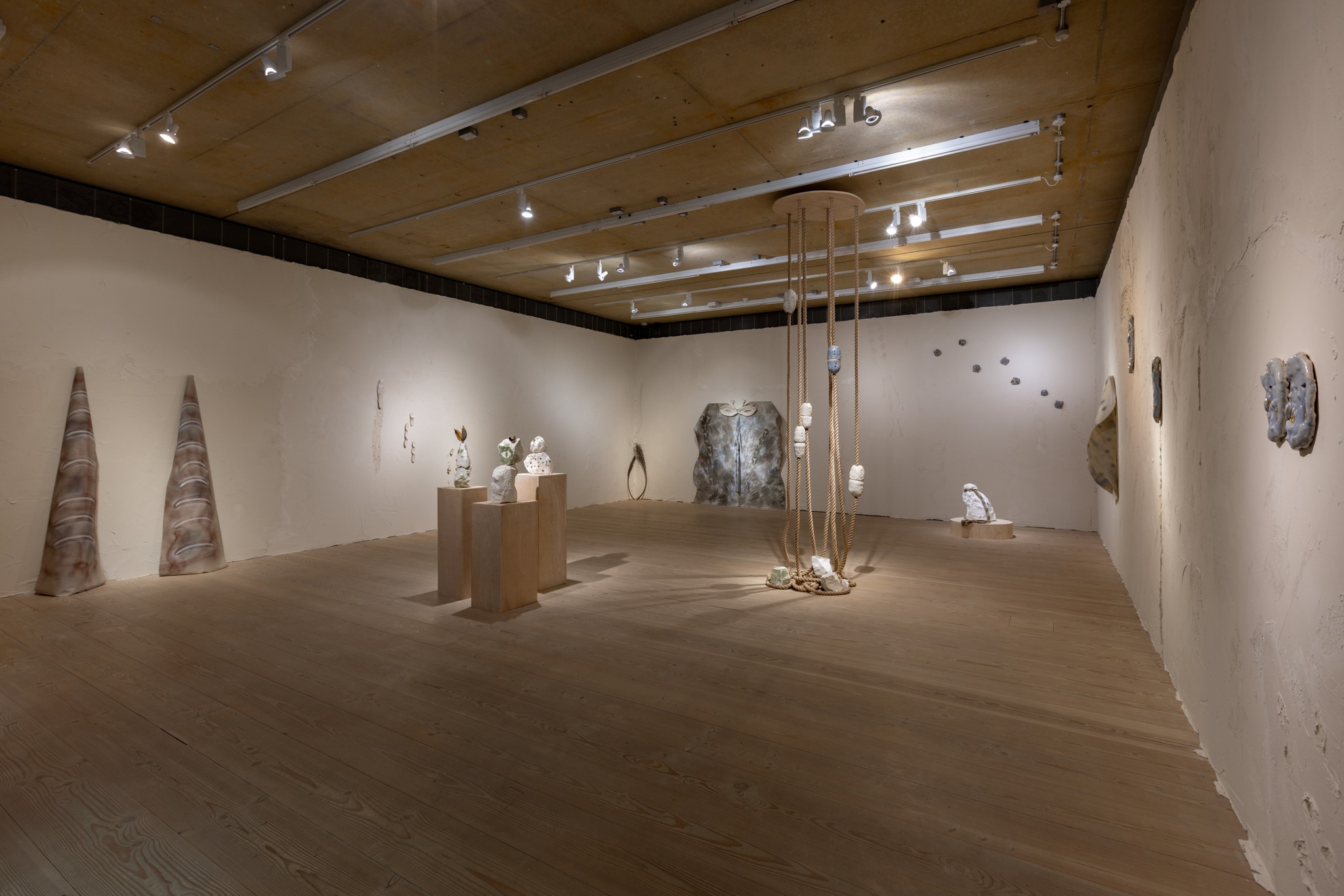 Focal Point explica que Faunal Succession está compuesta por tres ambientes que fusionan instalación, escultura, pintura, sonido y participación comunitaria. Cada espacio hace referencia a los estratos geológicos de la costa británica y sus organismos vivos, combinando interpretaciones científicas y poéticas del paisaje. El título de la exposición remite al principio de sucesión faunística: la observación de patrones cronológicos en los fósiles que permite a los geólogos datar con precisión las capas de roca sedimentaria. Para la artista, esta manifestación física del «tiempo profundo» se convierte en un marco para repensar las crisis humanas y ecológicas actuales, revelando que las fronteras y las identidades nacionales son conceptos construidos y recientes.