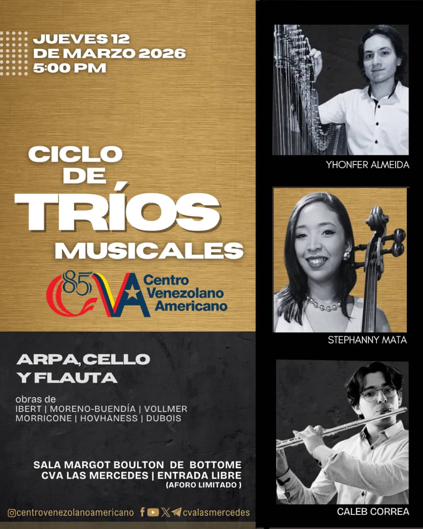 El jueves 12 de marzo de 2026, a las 5:00 p.m., continuará el Ciclo de Tríos Musicales en la Sala Margot Boulton de Bottome del CVA, con un concierto a cargo del arpista Yhonfer Almeida, la chelista Stephanny Mata y el flautista Caleb Correa, en el marco de la programación cultural que desarrolla el Centro Venezolano Americano para celebrar su 85 aniversario.